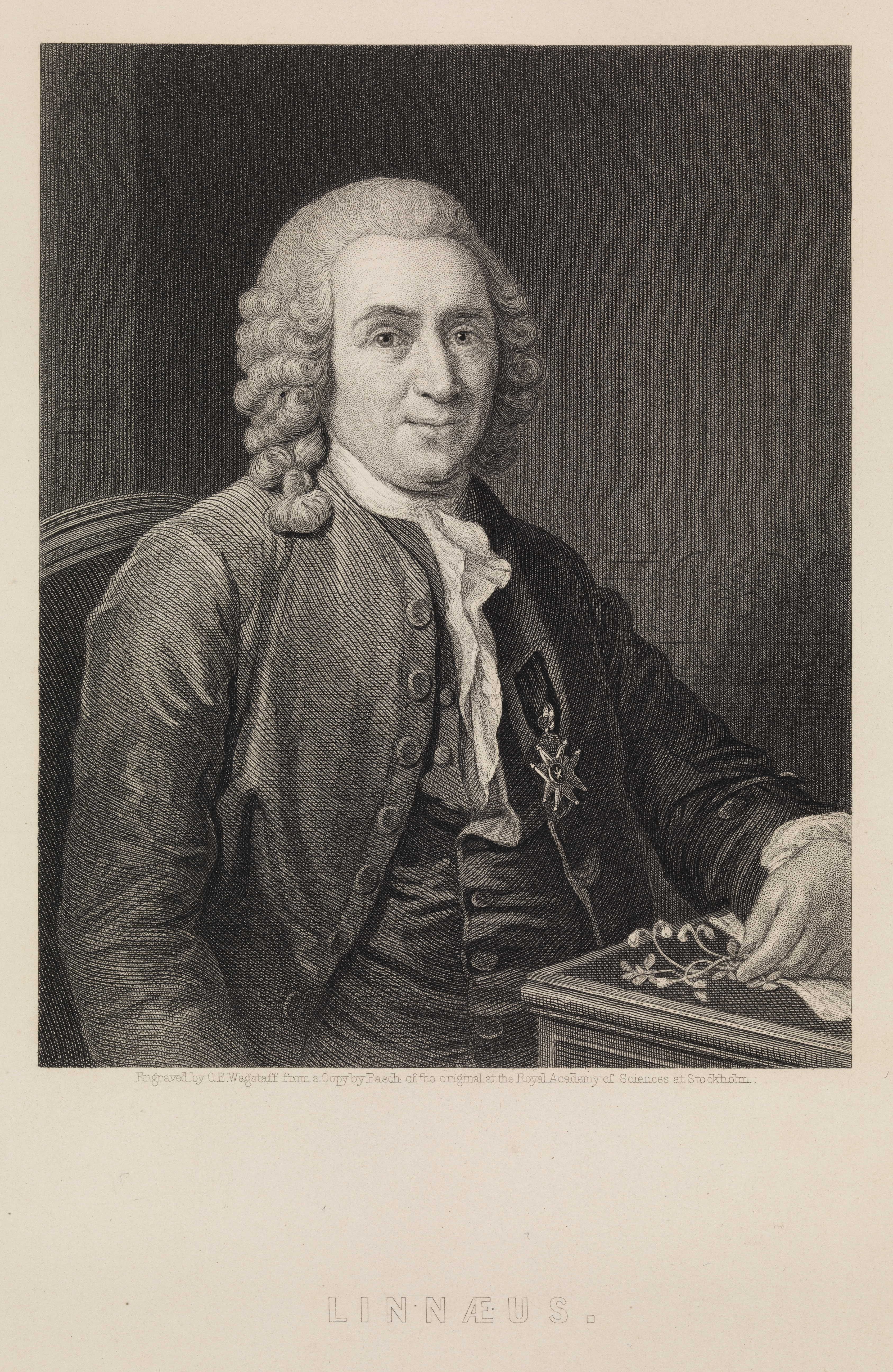 The Swedish botanist Carl von Linné or Carl Linnaeus (1707-1778), represented in this engraving, is today considered the father of taxonomy, namely the naming of plants. This engraving, where Linnaeus is portrayed half-length seated with hand resting on papers and holding a flower, was made by the British printmaker Charles Eden Wagstaff (1798-1850), from a copy by the Swedish painter Lorenz Pasch the Younger (1733-1805) after the original by Swedish portrait painter Alexander Roslin (1718-1798).