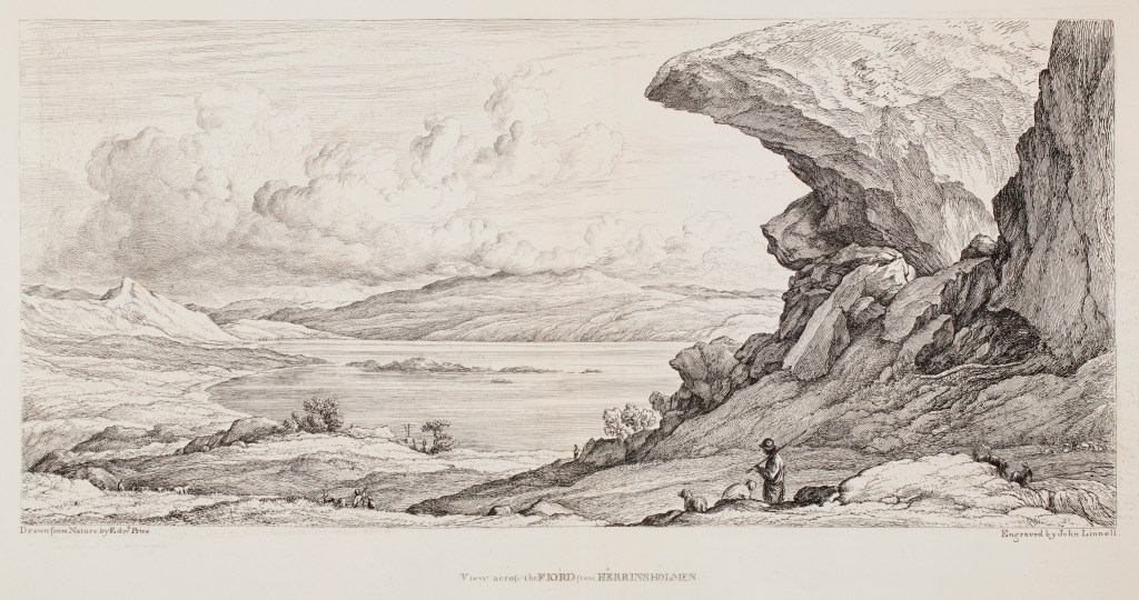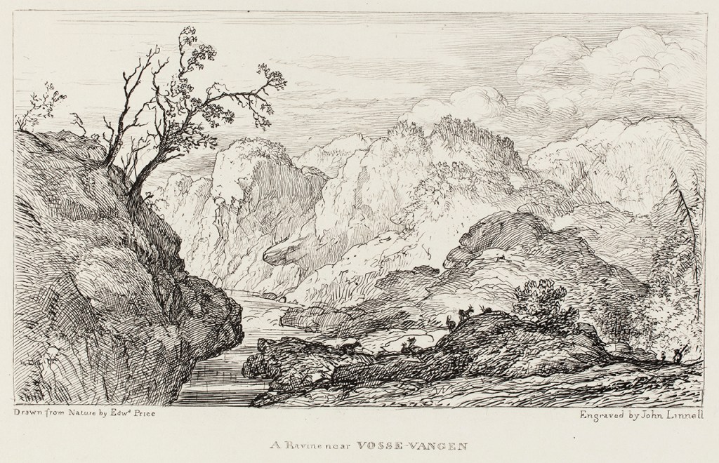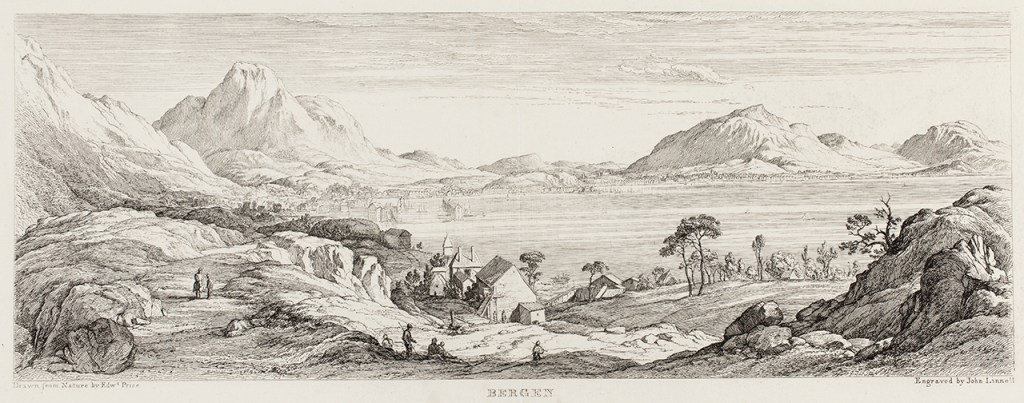 The artist Edward Price (1800-1885) is today all but forgotten, but his major enterprise, a journey to Norway in 1826, remains immortalised in his illustrated journal Norway. Views of Wild Scenery (1834). The seven engravings of Norwegian landscapes that are today part of the UCL Art Museum’s collections were made by the British painter and engraver John Linnell, The Elder (1792-1882) after drawings by Price but were not used as illustrations when Price’s book came out in 1834. The book included, instead, 21 engravings by the British artist Davis Lucas (1802-1881). Later Thomas Forester (dates unknown), who visited Norway in 1848, included Price’s journal in his Norway and Its Scenery (1853) and made use of the same engravings by Lucas. When comparing the engravings commissioned to Linnell and those appearing in the publication, it is interesting to observe that the Bergen motifs (of which Linnell made two) were entirely removed from the selection.