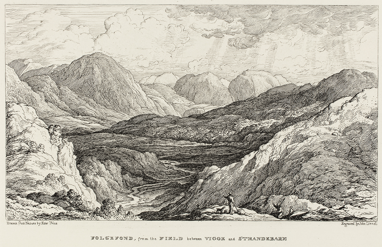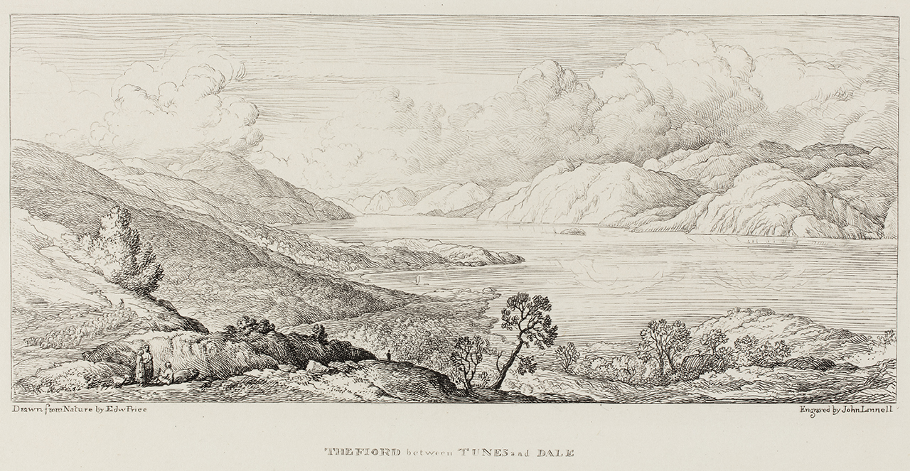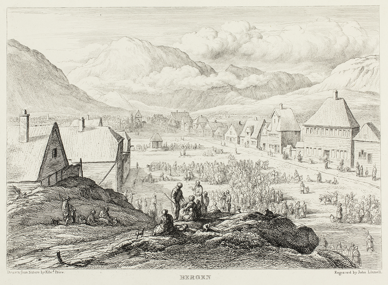The artist Edward Price (1800-1885) is today all but forgotten, but his major enterprise, a journey to Norway in 1826, remains immortalised in his illustrated journal Norway. Views of Wild Scenery (1834). The seven engravings of Norwegian landscapes that are today part of the UCL Art Museum’s collections were made by the British painter and engraver John Linnell, The Elder (1792-1882) after drawings by Price but were not used as illustrations when Price’s book came out in 1834. The book included, instead, 21 engravings by the British artist Davis Lucas (1802-1881). Later Thomas Forester (dates unknown), who visited Norway in 1848, included Price’s journal in his Norway and Its Scenery (1853) and made use of the same engravings by Lucas. When comparing the engravings commissioned to Linnell and those appearing in the publication, it is interesting to observe that the Bergen motifs (of which Linnell made two) were entirely removed from the selection.