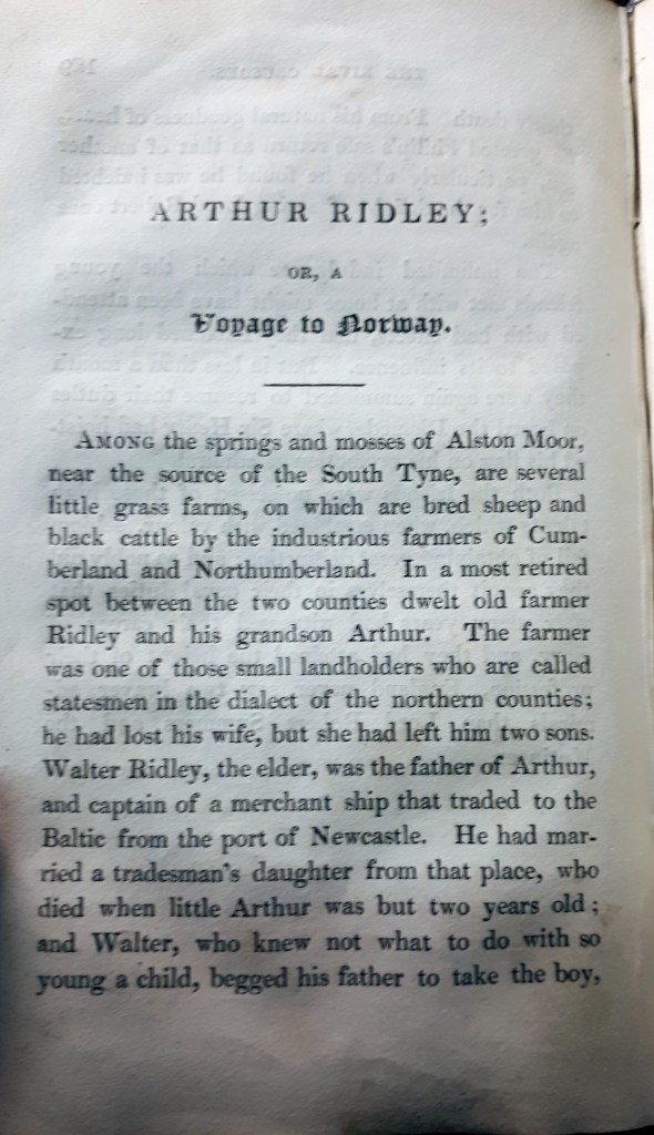 From the end of the eighteenth century, Norway became an increasingly popular destination for British travellers in search of alternatives to the more well-trodden paths and thus an equally popular setting of travel accounts and fiction in British literature. The three examples exhibited here are representative of this trend: the renowned publication Letters Written During a Short Residence in Sweden, Norway, and Denmark (1796) by Mary Wollstonecraft (1759-1797); the illustrated book Scandinavian Sketches, or, A Tour in Norway (1835) by William Henry Breton who travelled to Scandinavian in 1834; the children’s story ‘Arthur Ridley; or, Voyage to Norway’ first published by Agnes Strickland (1796-1874) in 1826 as part of her collection of children’s stories entitled The Rival Crusoes. Strickland never vised Norway.