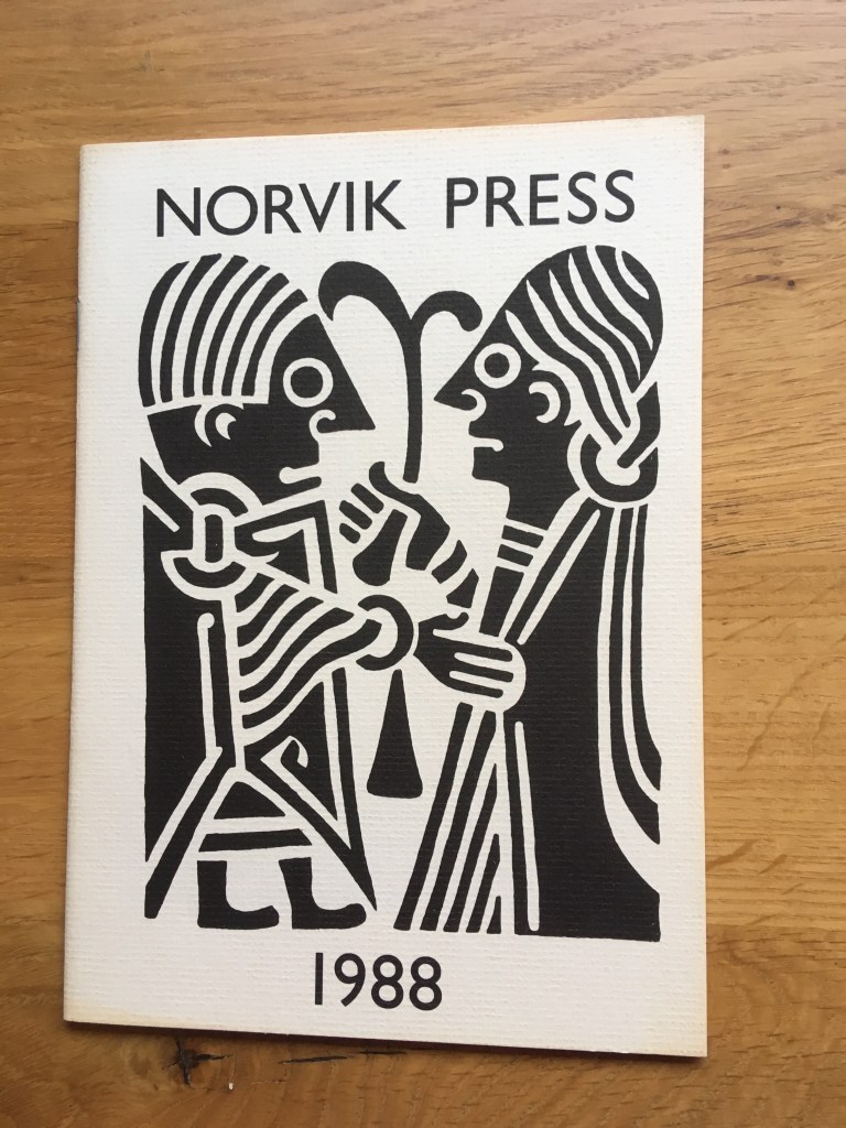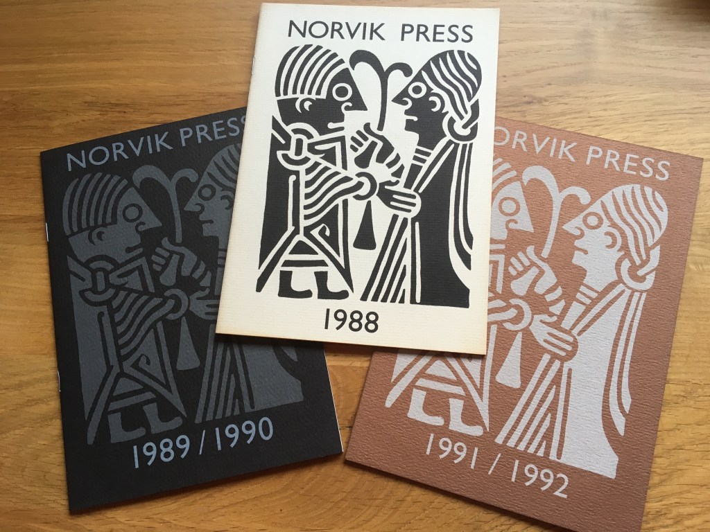 Norvik Press was founded by Professor James McFarlane and Professor Janet Garton at the University of East Anglia in 1986 with the aim of producing good quality English translations from Nordic literature or studies of Nordic writers. Displayed here are the first catalogues of the press which is today based at the UCL Department of Scandinavian Studies. The catalogues feature on the cover the iconic logo of the press, a black-and-white designed based on a drawing of a tenth-century Viking brooch. Today, Norvik Press continues to produce translations as well as publish the journal Scandinavica. An International Journal of Scandinavian Studies and Swedish Book Review. As of 2020 both journals are now online and open access.