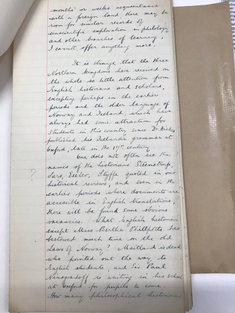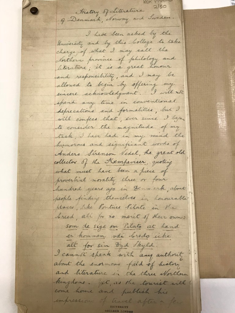 UCL is home to the first Department of Scandinavian Studies in the UK. Professor William Paton Ker (1855-1923), who was appointed Quain Professor of English Language and Literature at UCL in 1889, was asked by the College to take on the directorship of the newly founded Department of Scandinavian Studies in 1917. UCL Special Collections has preserved the manuscript of Ker’s lecture ‘History of literature of Denmark, Norway and Sweden’, given on occasion of his appointment to ‘take charge of […] the Northern province of philology and literature’ (as he states himself in the opening remarks of his lecture). Over a century later, the Department of Scandinavian Studies at UCL is today one of the only two left in the UK, alongside that at the University of Edinburgh.